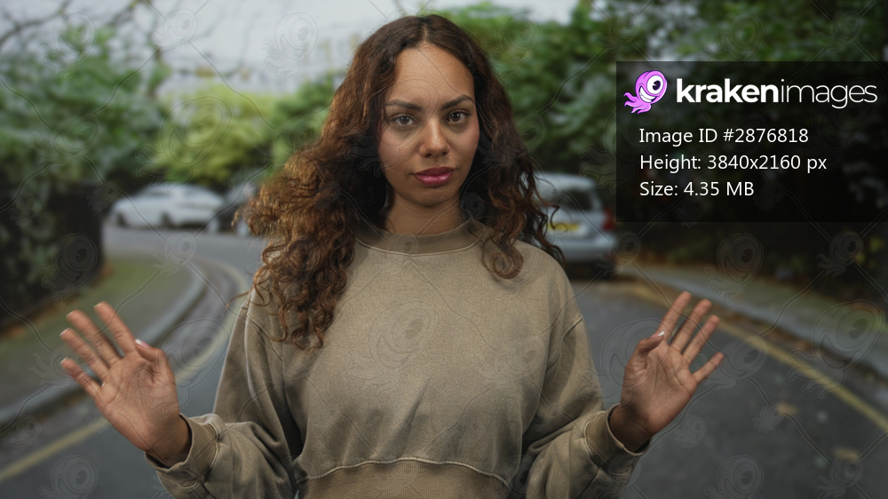 Young woman standing on a quiet street with hands raised palms out wearing sweatshirt, facing forward; calm defiance.
