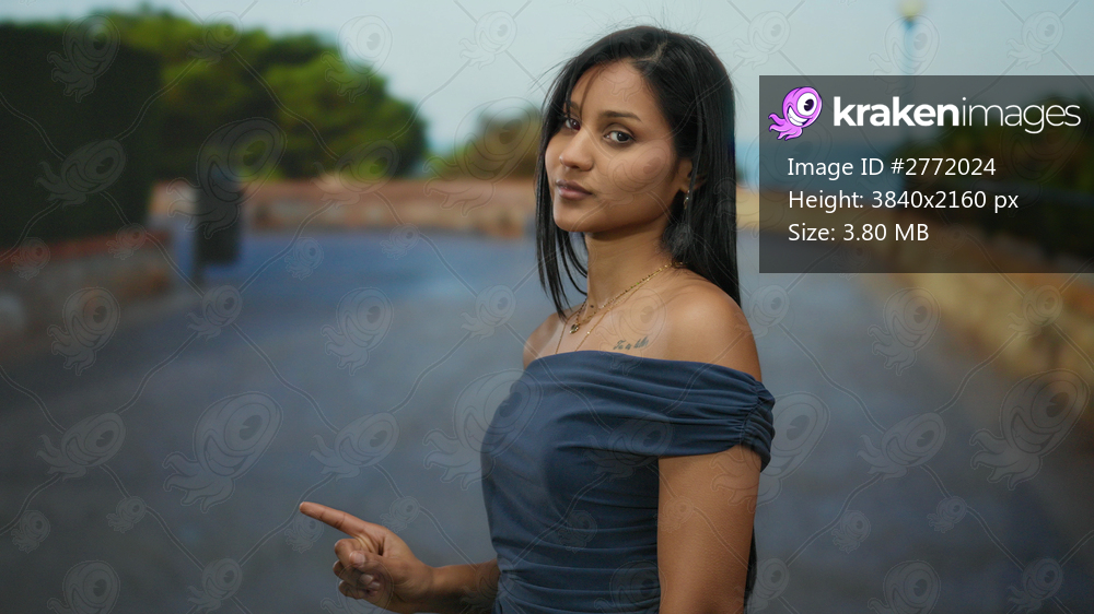 Young woman standing on a street outdoors, pointing with her finger, wearing an elegant dress and gold jewelry, surrounded by greenery under a clear sky. - Kraken Images