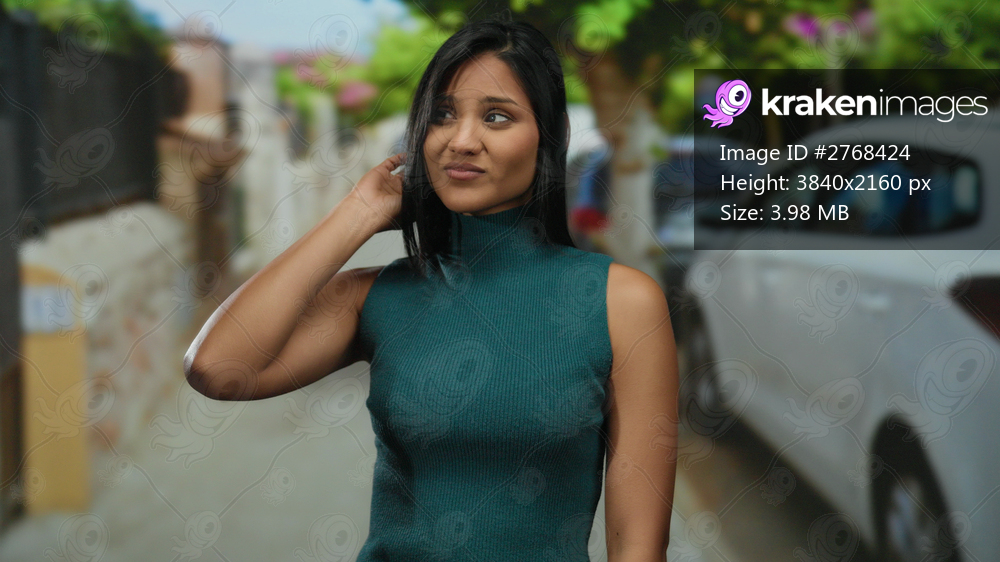 Young woman standing on street with trees and cars conveying contemplation and emotion in an outdoor urban environment.