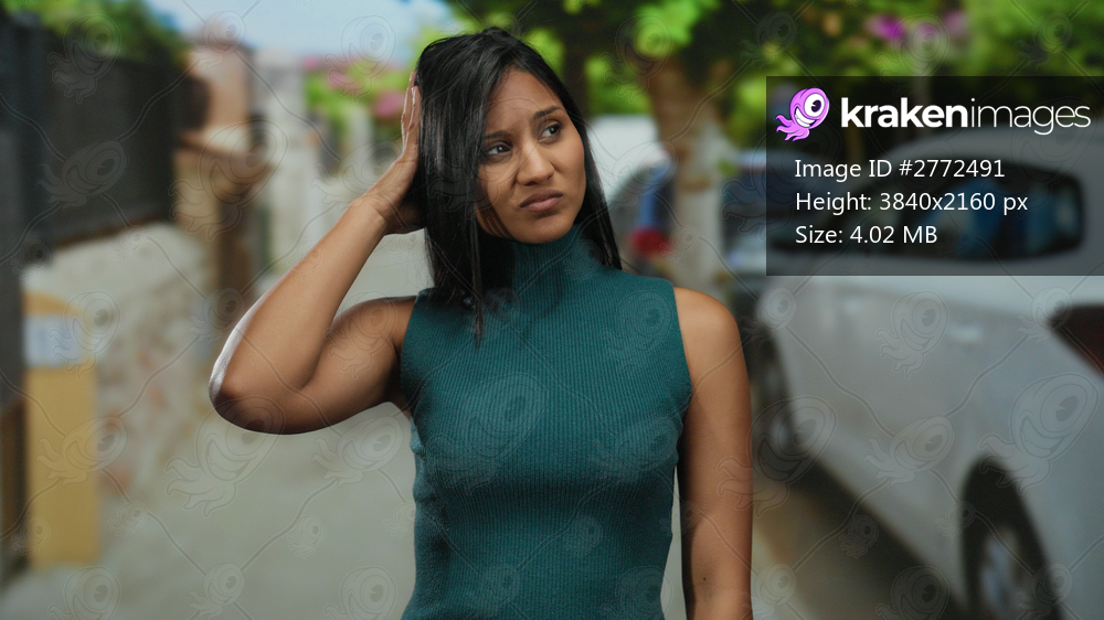 Young woman standing on street with trees and cars conveying contemplation and emotion in an outdoor urban environment.