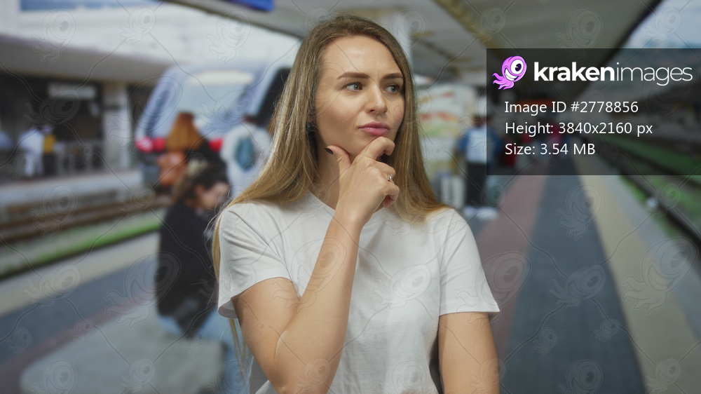Young woman standing pensively at a busy outdoor train station with a thoughtful expression as people wait on the railway platform.