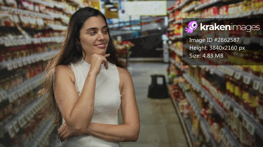 Young woman stands with hand on chin amidst grocery shelves in supermarket building; quiet reflection.