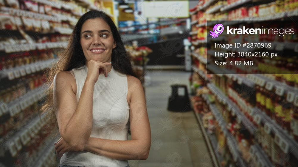 Young woman stands with hand on chin amidst grocery shelves in supermarket building; quiet reflection.
