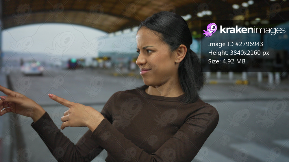 Young woman stands outside an airport terminal, looking thoughtful against a backdrop of a modern architectural roof and distant vehicles.