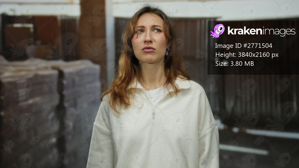 Young woman stands thoughtfully indoors at a construction site with stacks of materials, conveying contemplation and focus in a casual setting.