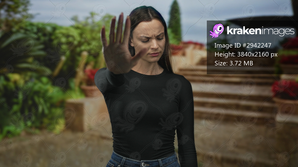 Young woman with stern expression holding palm out for stop in front of stone steps at building entrance outdoors; defiance.