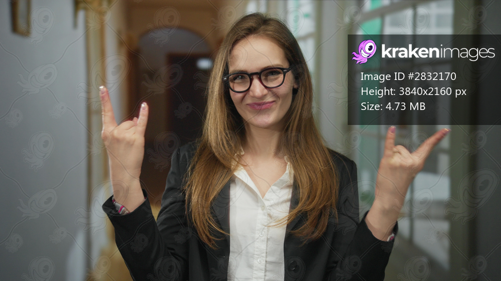 Young woman sticks out her tongue and makes rock horns gesture in a bright hotel hallway; energy excitement.