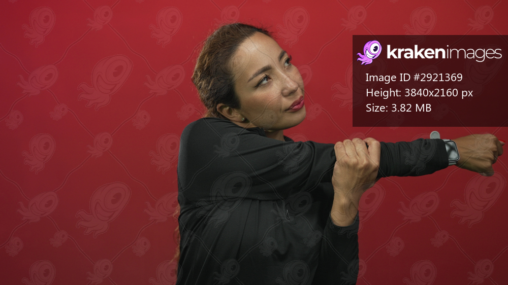 Young woman stretching wrist and pulling her forearm while checking a smartwatch in a red studio; calm focus.