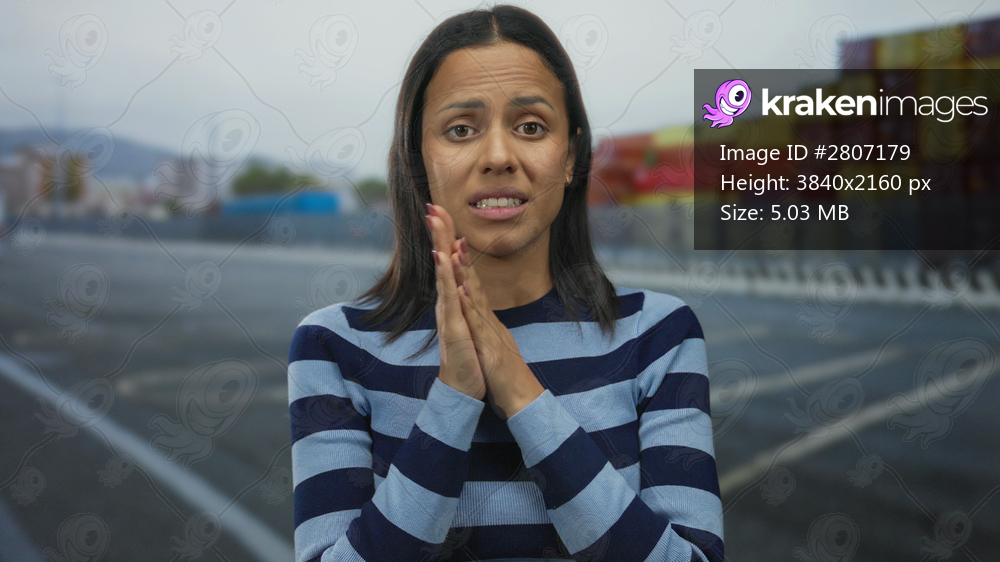 Young woman with striped shirt stands concerned at port with shipping containers in the background suggesting an outdoor seaside location.