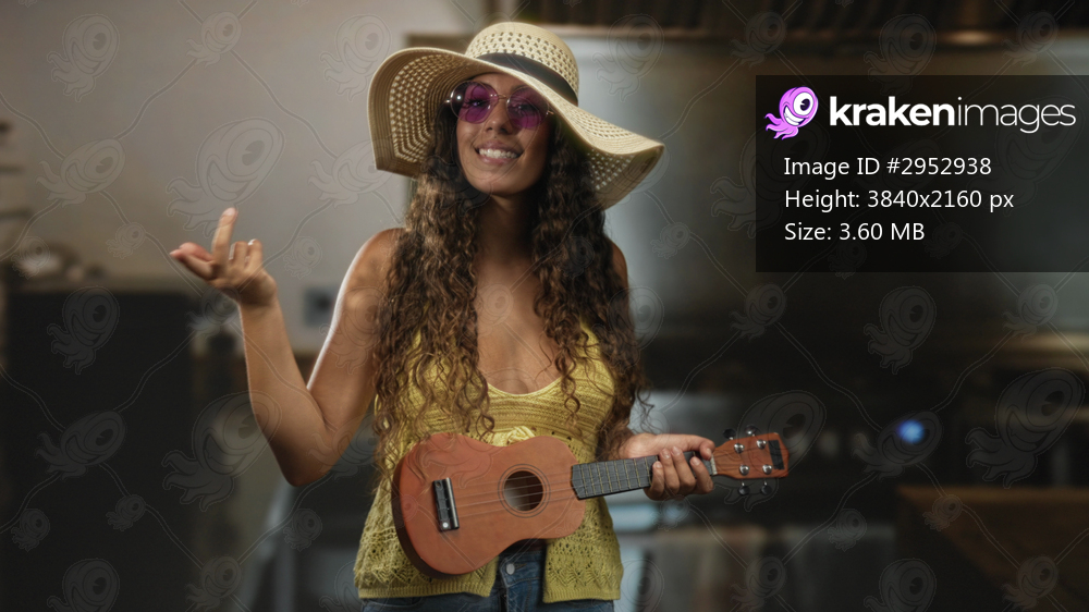 Young woman strumming ukulele in a commercial kitchen, wearing straw hat and purple sunglasses, smiling and gesturing with free hand; carefree summer joy. - Kraken Images
