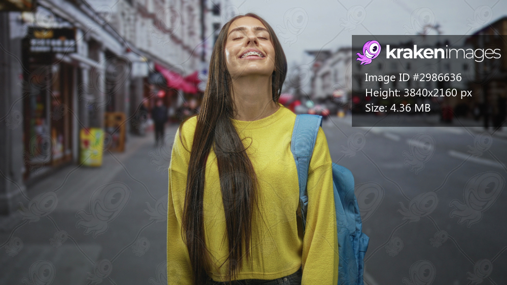 Young woman student with blue backpack tilts head back, eyes closed on a street wearing yellow sweater; quiet relief.