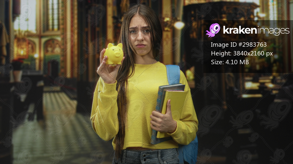 Young woman student holding a yellow piggy bank and clutching books in church; financial worry debt.