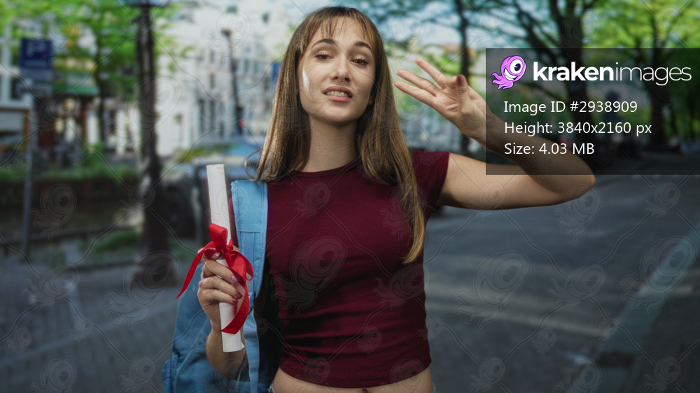 Young woman student holding diploma tied with red ribbon and flashing victory fingers on a city street; celebration achievement success.