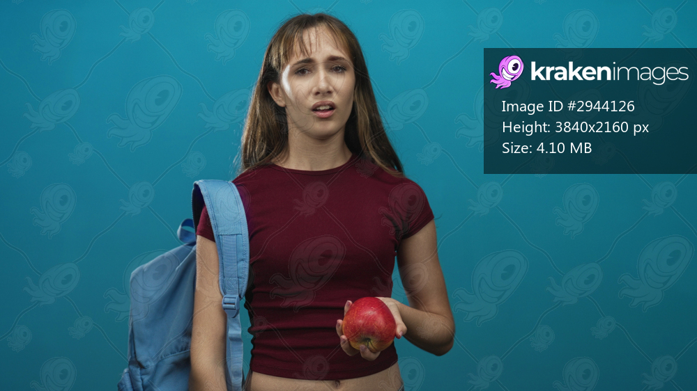 Young woman student holding red apple and blue backpack strap, head tilted back in teal studio; fatigue study stress.