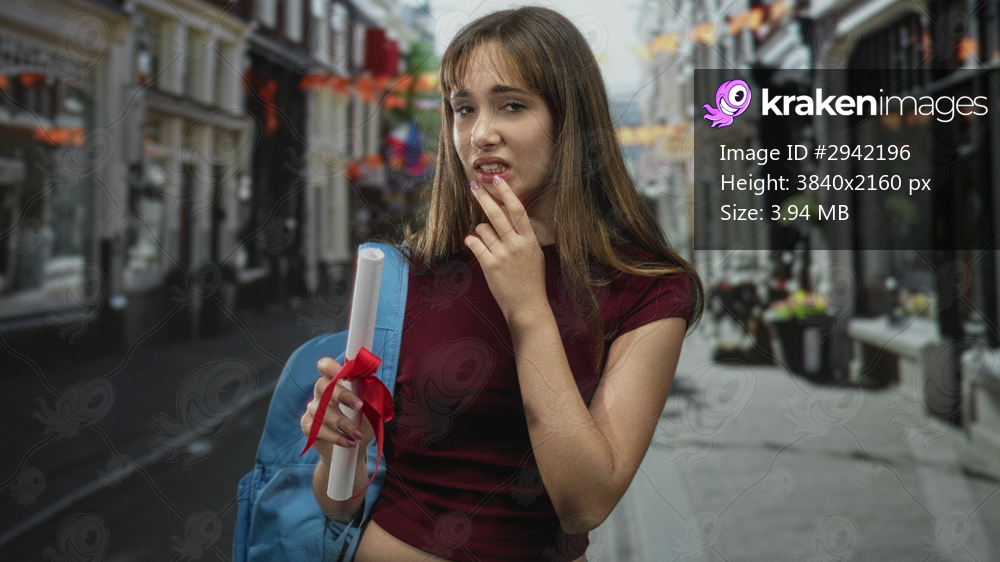 Young woman student holding rolled diploma tied with red ribbon and blue backpack, fingernail to lips biting nervously while standing on a narrow street; anxiety uncertainty. - Kraken Images