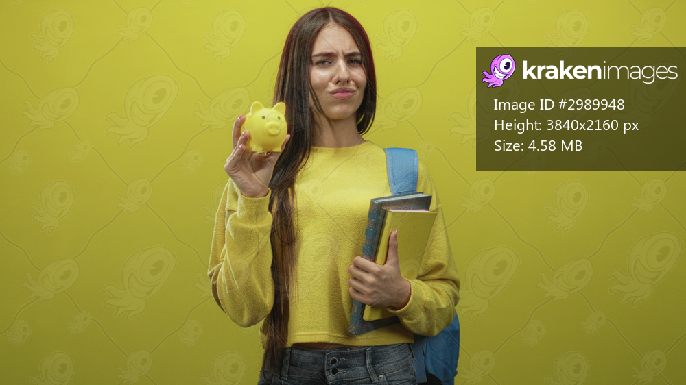 Young woman student holding yellow piggybank and textbooks, grimacing and shrugging in a studio; financial worry.