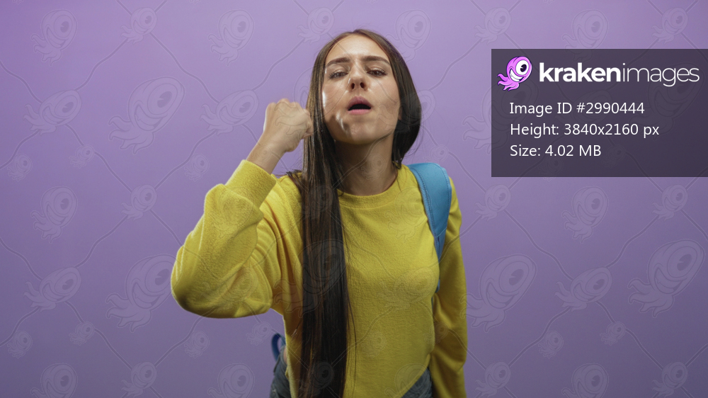 Young woman student in yellow sweater and blue backpack raises a clenched fist toward camera in studio; anger defiance.