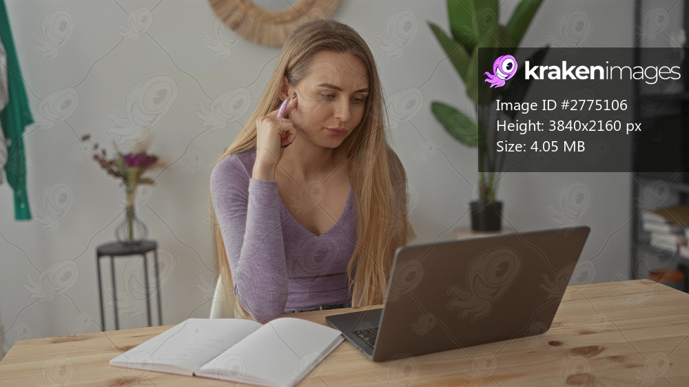 Young woman studying at home in a cozy living room, focused with a laptop and notebook, wearing a purple top, surrounded by books and plants.