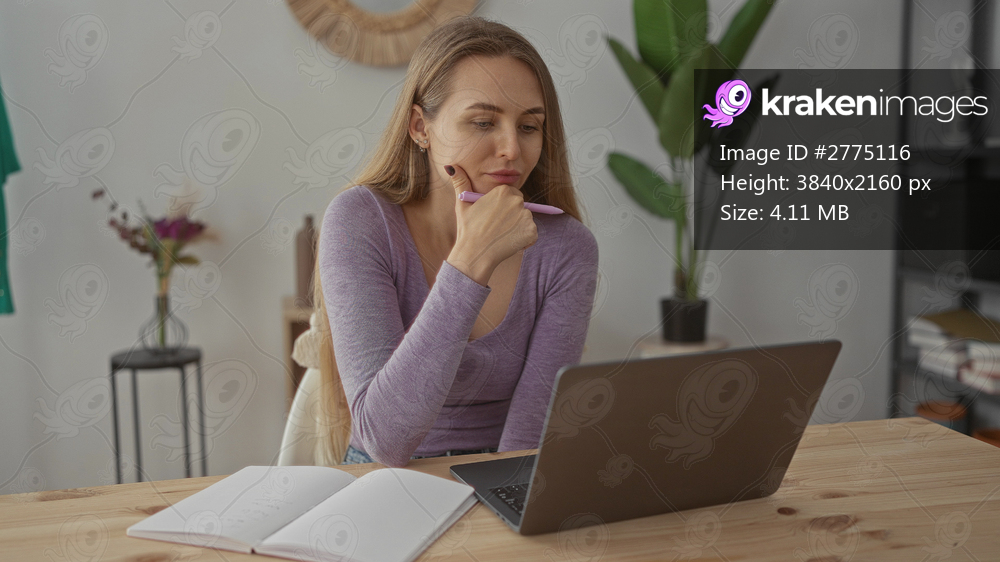 Young woman studying at home in a cozy living room, focused with a laptop and notebook, wearing a purple top, surrounded by books and plants.