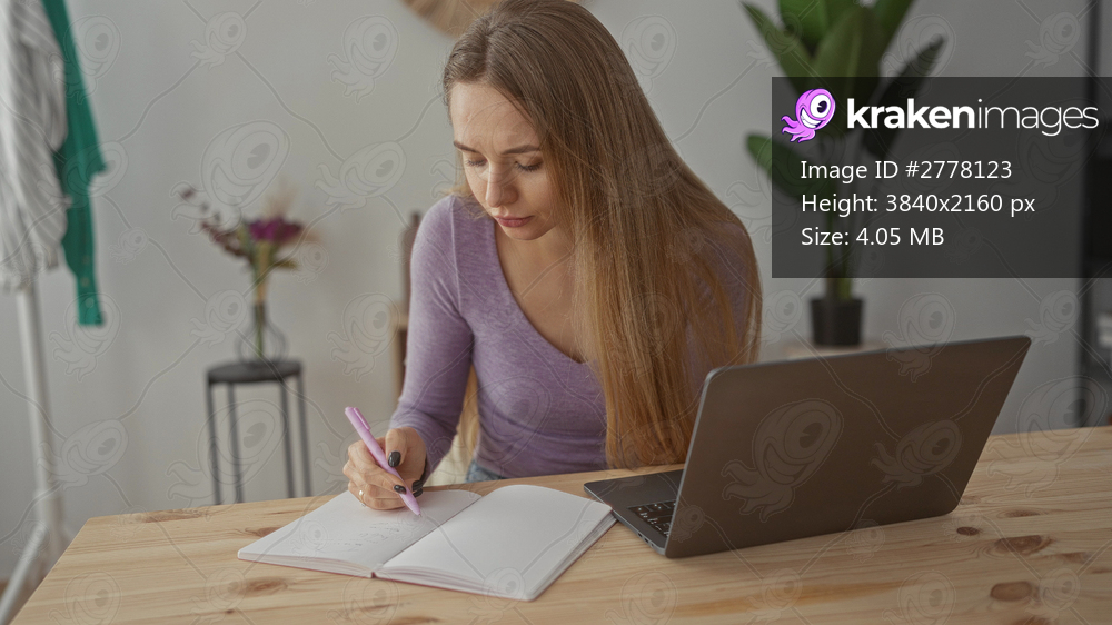 Young woman studying at home in a cozy living room, focused with a laptop and notebook, wearing a purple top, surrounded by books and plants.