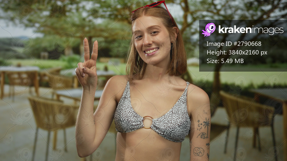 Young woman with sunglasses smiling and showing peace sign on sunny restaurant terrace with outdoor seating surrounded by nature scenery in the background. - Kraken Images