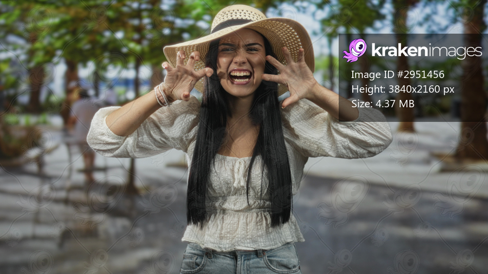 Young woman with sunhat making clawing hands and open mouth roar gesture on a street lined with trees and benches; playful joy.