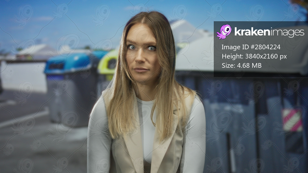 Young woman with surprised expression on city street outdoors near recycling bins urban setting blonde hair