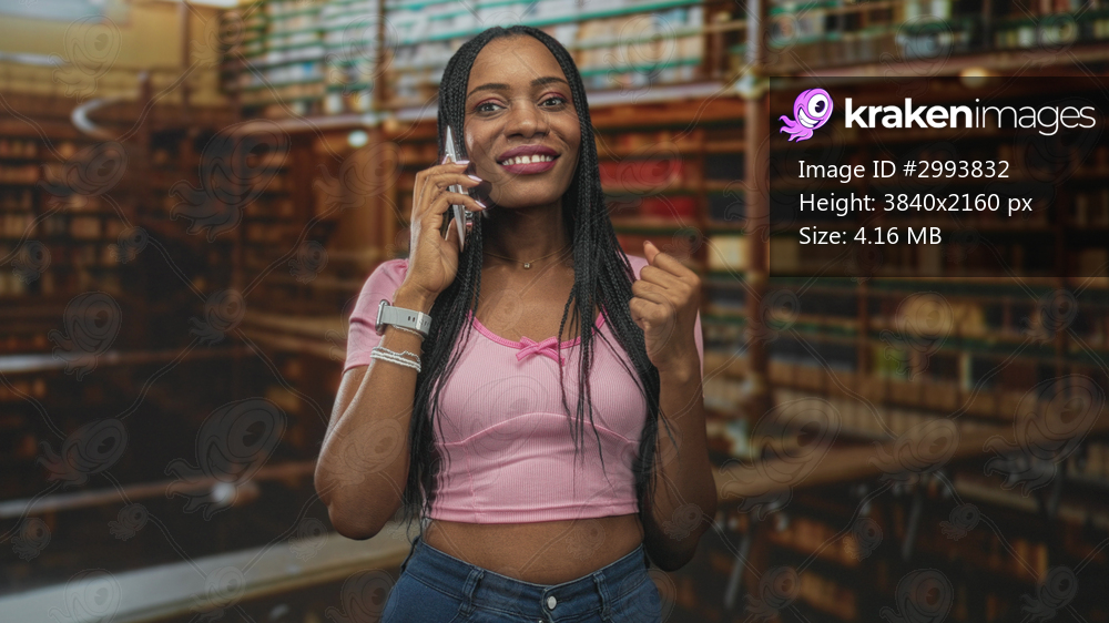 Young woman talking on a smartphone, hand to ear and smiling, wearing a pink crop top in a library; joyful conversation.