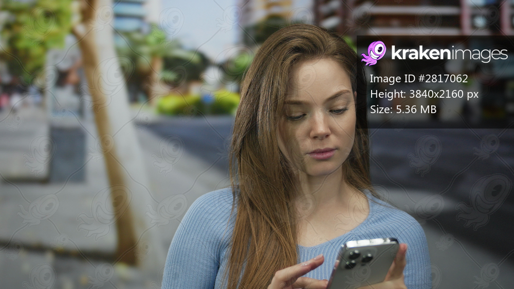 Young woman taps smartphone screen while standing on busy street sidewalk beside parked cars; quiet concentration.