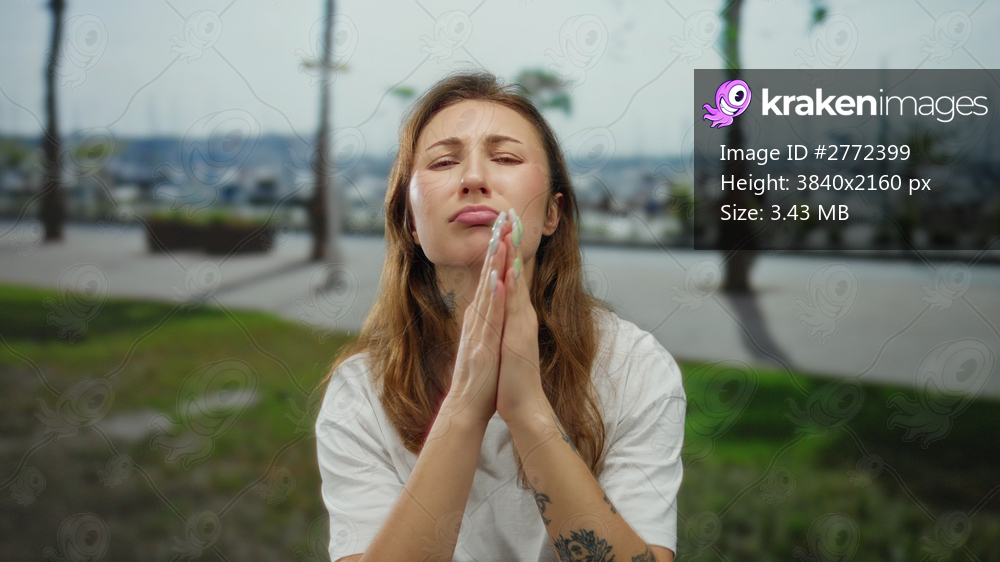 Young woman with tattoos praying outdoors on a city street with palms and a marina in the background, expressing hope and spirituality with closed eyes. - Kraken Images