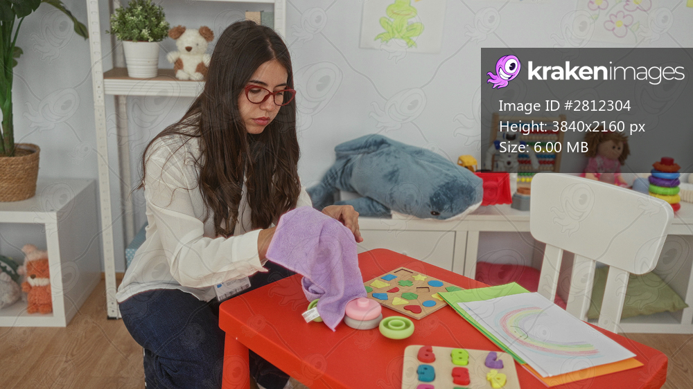 Young woman teacher cleaning preschool classroom table with toys and educational tools in a bright kindergarten setting.