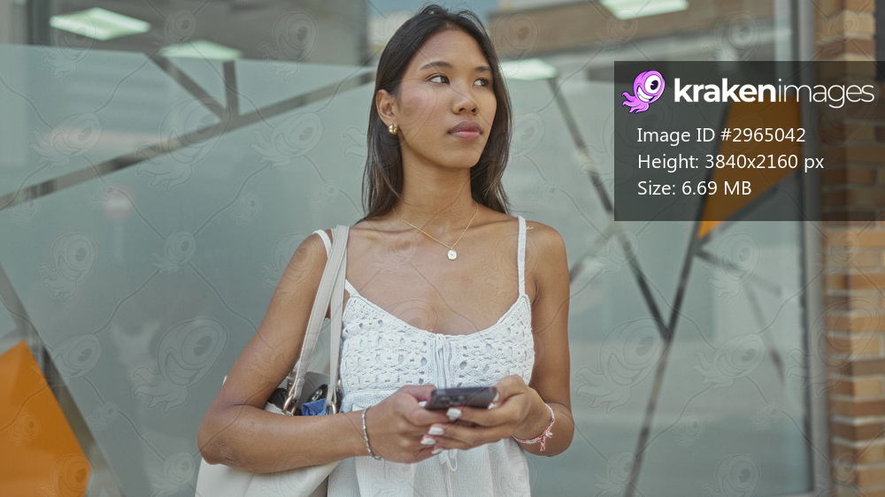 Young woman texting on a smartphone, bare hands visible and wearing a white sundress in front of a building glass facade; calm focus.