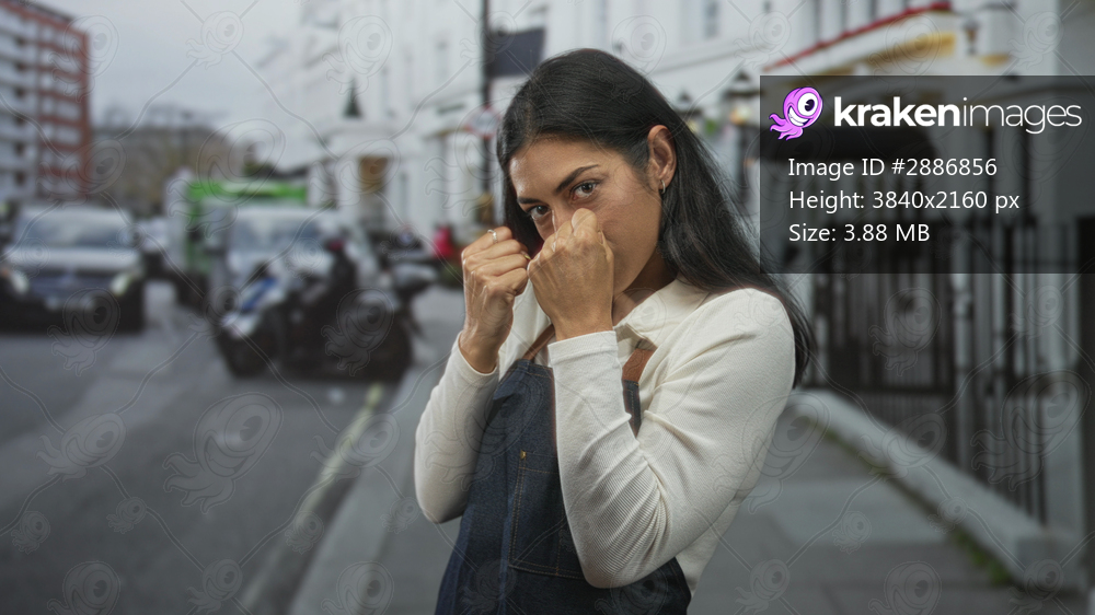 Young woman throwing a punch with fists on a city street in front of townhouse facades; determination.