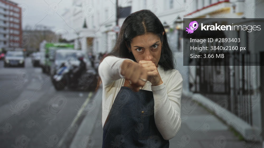 Young woman throwing a punch with fists on a city street in front of townhouse facades; determination.