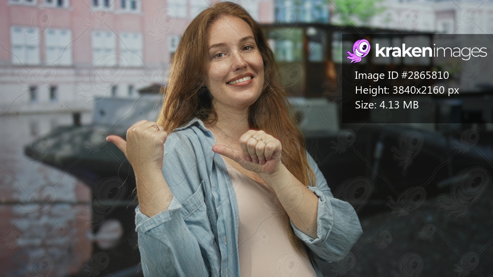 Young woman with thumbs pointed to her chest beside an amsterdam canal on a street walkway reflecting urban life; confidence pride empowerment.
