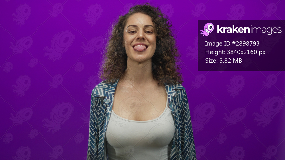 Young woman with tongue out and visible breast wearing white tanktop and patterned shirt in purple studio; playful energy.