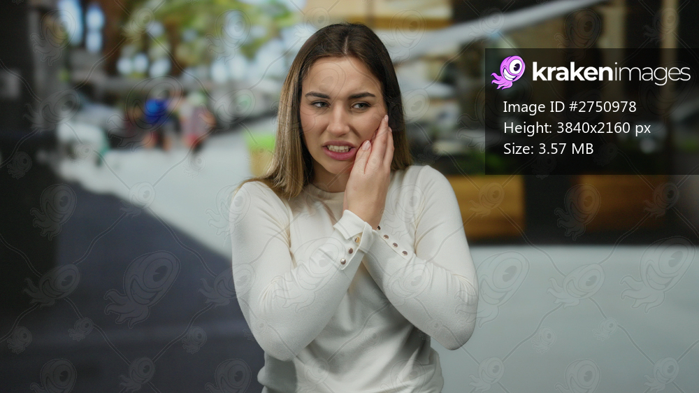 Young woman with tooth pain standing outdoors on a busy street, wearing a white shirt and looking distressed, touching her cheek while pedestrians move in the blurred background. - Kraken Images