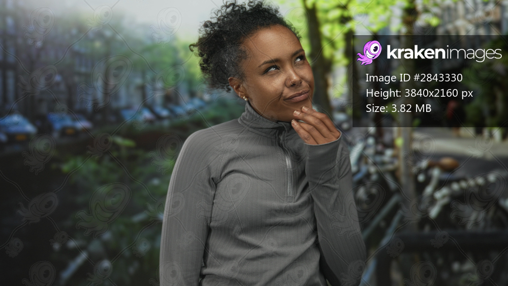 Young woman touches chin with pensive thinking gesture on street; thought doubt pondering contemplation.