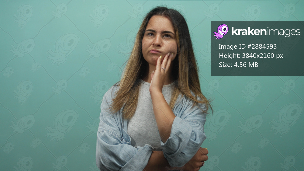 Young woman touching cheek and squinting in a studio teal backdrop, wearing denim jacket and grey tee, hand resting on jaw; thinking.