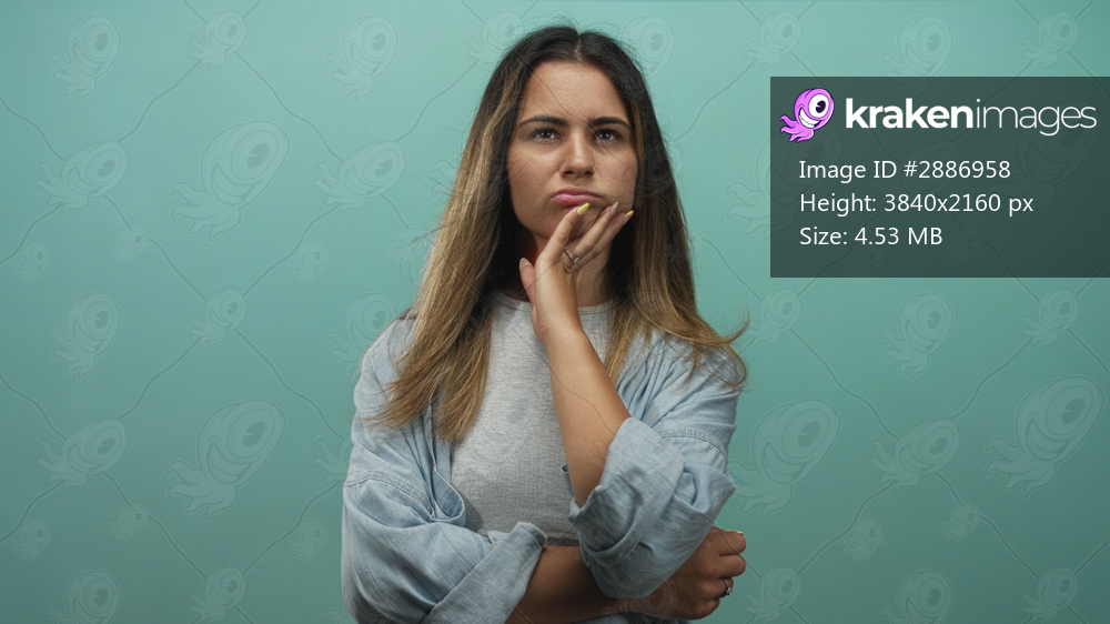 Young woman touching cheek and squinting in a studio teal backdrop, wearing denim jacket and grey tee, hand resting on jaw; thinking.