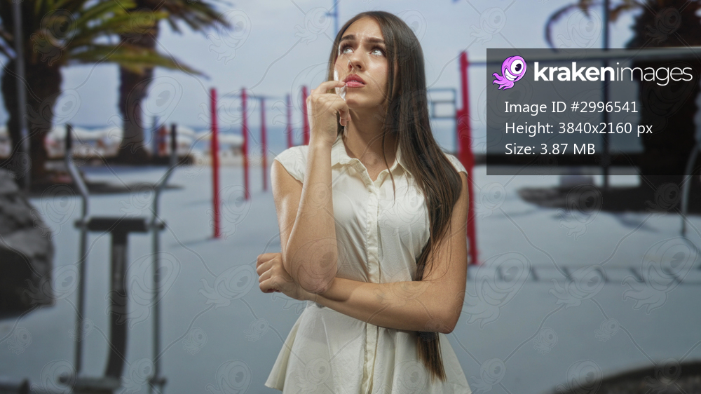 Young woman touching chin with finger and crossed arms at a beach outdoor gym by seaside pullup bars and palm trees visible; uncertainty.