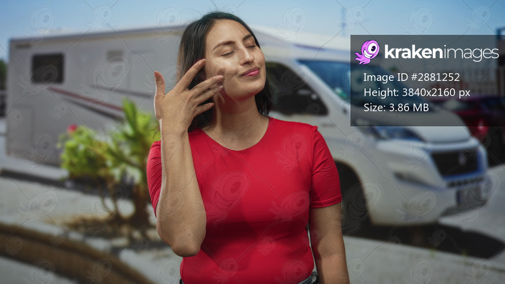 Young woman touching face and flipping hair beside white camper van parked on sunny urban street; carefree joy.
