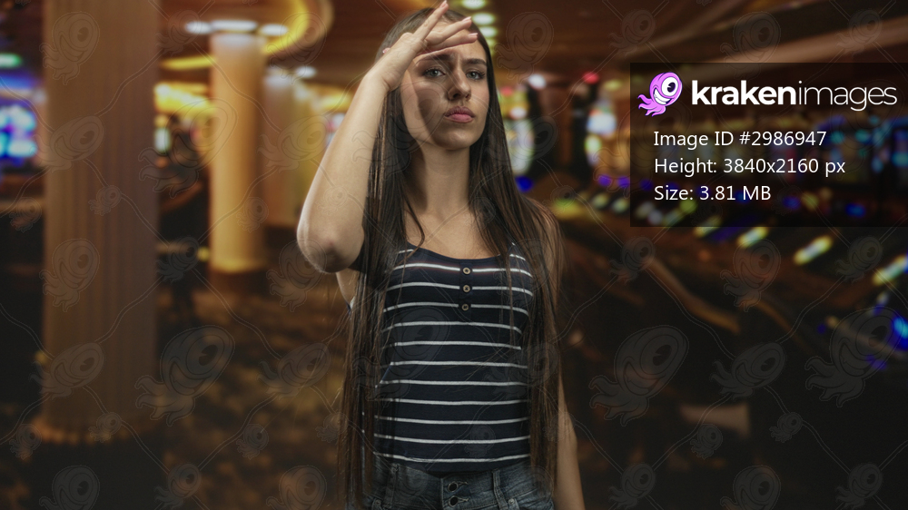 Young woman touching forehead inside a casino building, wearing striped tank top and jeans, long hair visible; frustration doubt.