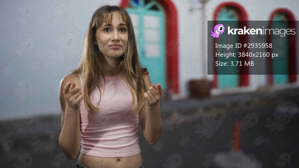 Young woman touching hair, bare stomach visible, looking unsure on a cobblestone street with turquoise doors; hesitation.