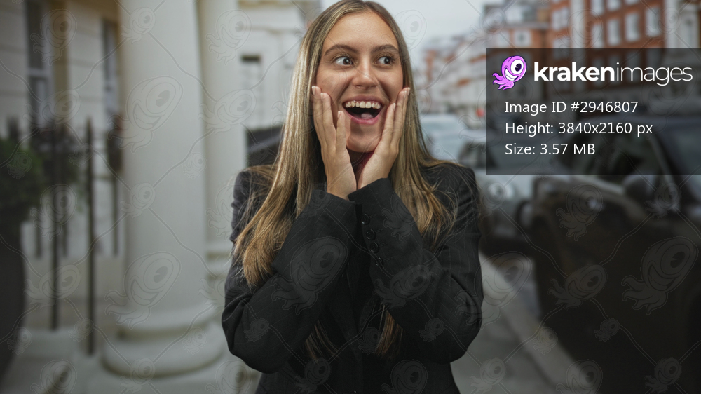 Young woman touching her cheeks with both hands and smiling on a city street by parked cars and building columns; surprise spontaneous moment.