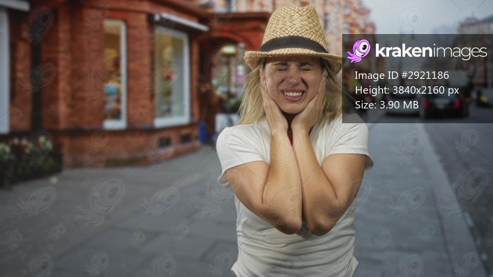Young woman touching her face and squinting on a busy street beside brick storefront wearing straw hat and white tshirt; travel frustration.
