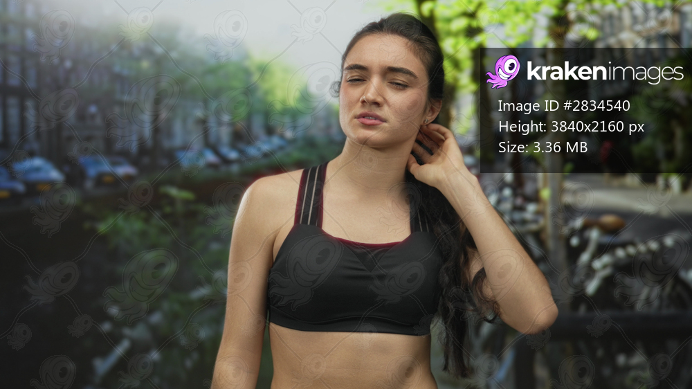 Young woman touching her neck with one hand for neckache on city street near canal bikes; discomfort.