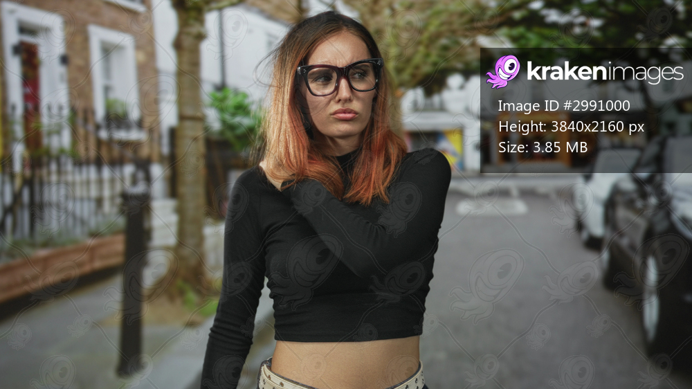 Young woman touching her shoulder and showing bare midriff, wearing oversized glasses on a street; pensive solitude.