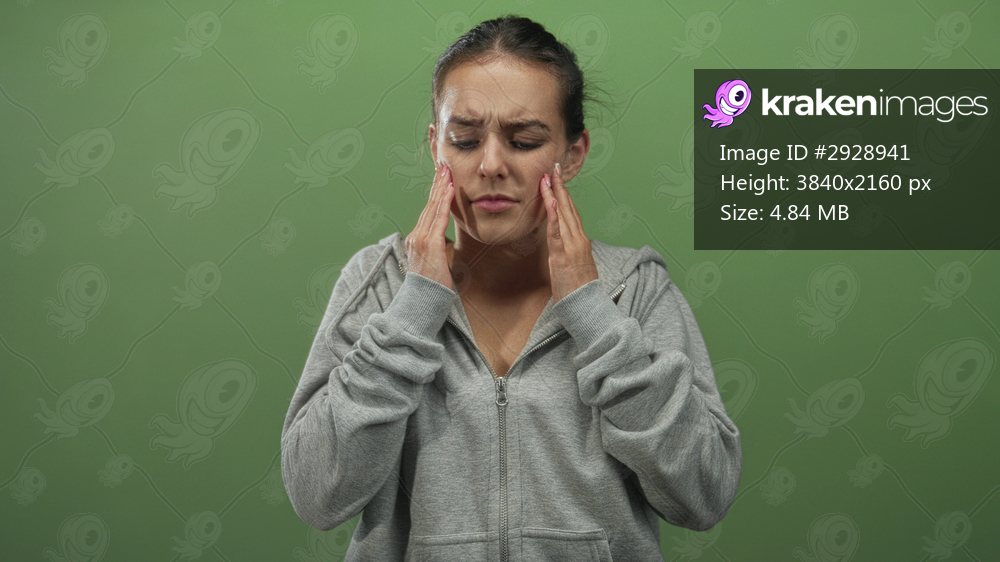 Young woman touching her temples with both hands, face strained in studio with green backdrop; headache pain.