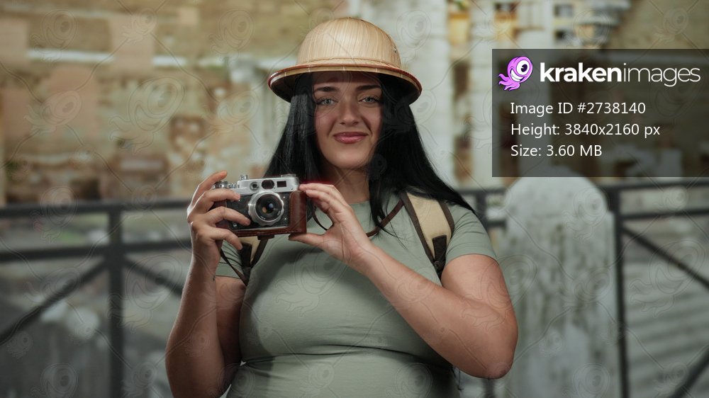 Young woman tourist with camera in front of roman ruins in rome, capturing her travel moments, showcasing her adventurous spirit.